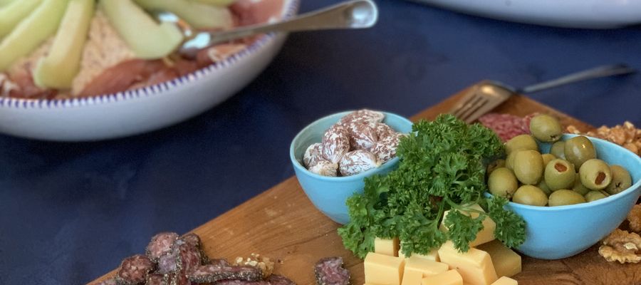 • Tapasplank bestaande uit twee soorten fuet, kaas, olijven en gevulde paprika en kaasstengels